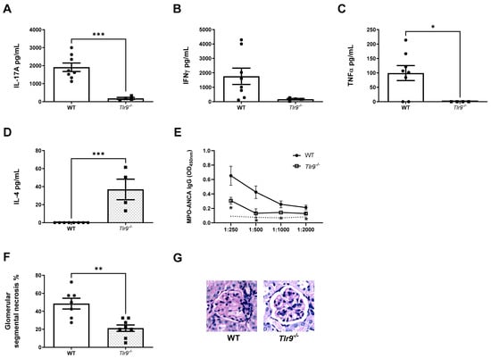 Enhanced TH17 Additionally, TH1 MPO autoimmunity induced by TLR9 stimulated MPO pulsed dendritic cells is dependent on TLR9 ligation. (A): Decreased production of IL-17A in mice receiving TLR9 stimulated MPO pulsed Tlr9−/− DCs compared to WT DCs. (B): Decreased (ns) production of IFN-γ in mice receiving TLR9 stimulated MPO pulsed Tlr9−/− DCs. (C): Decreased production of tissue necrosis factor alpha (TNFα) in mice receiving TLR9 stimulated MPO pulsed Tlr9−/− DCs. (D): Increased production of interleukin 4 (IL-4) in mice receiving TLR9 stimulated MPO pulsed Tlr9−/− DCs. (E): Decreased serum MPO-ANCA IgG in mice receiving TLR9 stimulated MPO pulsed Tlr9−/− DCs compared to WT DCs. Dotted line represents the OD450 of sera from control, OVA immunized mice receiving anti-GBM globulin. Kidney injury was assessed at Day 18. (F): Decreased kidney injury in mice receiving TLR9 stimulated MPO pulsed Tlr9−/− DCs. (G) Periodic-acid Schiff-stained micrographs of glomeruli were taken at original magnification ×400. Bars show the mean +/− SEM. * = p <0.05, ** = p < 0.01, *** = p < 0.001. DC = Dendritic cell. Mouse numbers for experiment: WT: n = 8, Tlr9−/−: n = 8.