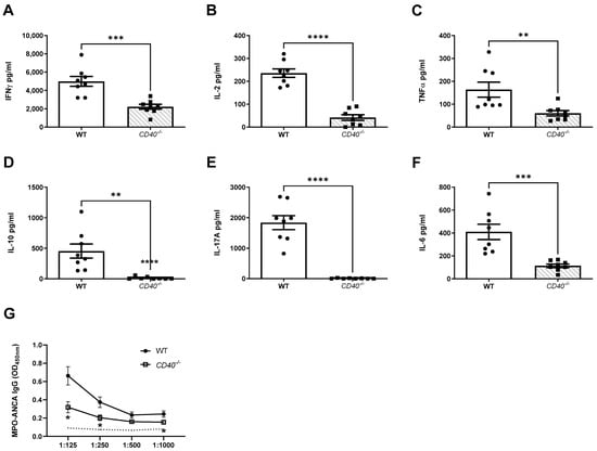 CD40 upregulation on TLR9 stimulated MPO pulsed dendritic cells is critical for the enhancement of MPO autoimmunity. Early Immune Responses Model (Day 10): (A): Reduced production of IFN-γ in mice receiving TLR9 stimulated MPO pulsed CD40−/− DCs compared to WT DCs. (B): Reduced production of interleukin 2 (IL-2) in mice receiving TLR9 stimulated MPO pulsed CD40−/− DCs. (C): Reduced production of TNFα in mice receiving TLR9 stimulated MPO pulsed CD40−/− DCs. (D): Reduced production of interleukin 10 (IL-10) in mice receiving TLR9 stimulated MPO pulsed CD40−/− DCs. (E): Reduced production of IL-17A in mice receiving TLR9 stimulated MPO pulsed CD40−/− DCs. (F): Reduced production of interleukin 6 (IL-6) in mice receiving TLR9 stimulated MPO pulsed CD40−/− DCs. (G): Decreased serum MPO-ANCA IgG in mice receiving TLR9 stimulated MPO pulsed CD40−/− DCs compared to WT DCs. Dotted line represents the OD450 of sera from control, OVA immunized mice receiving anti-GBM globulin. Bars show the mean +/− SEM. ** = p < 0.01, *** = p < 0.001, **** = p < 0.0001. DC = Dendritic cell. Mouse numbers for experiment: WT: n = 8, CD40−/−: n = 8.