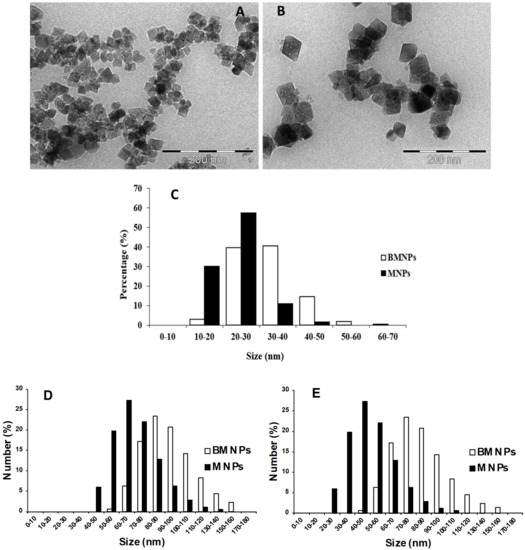 TEM images of MNPs (A) and BMNPs (B) (Scale bar = 200 nm.). (C) Size distribution of MNPs and BMNPs according to TEM analysis. Size distribution according to DLS data of BMNPs and MNPS resuspended in PBS pH 7.4 (D) and cell culture medium (E). All the DLS measurements were performed in triplicate.