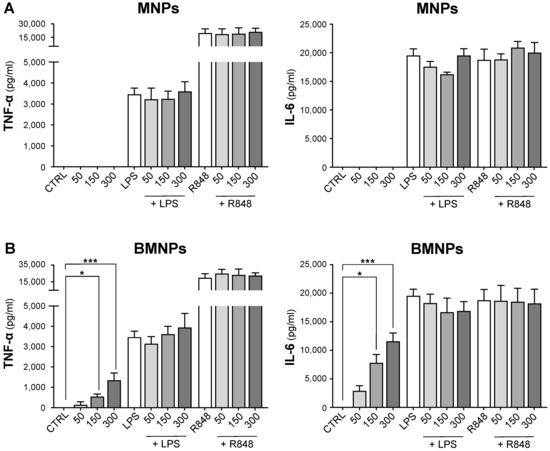 Effects of MNPs and BMNPs on TNF-α and IL-6 release by human monocytes. Monocytes were treated or not (CTRL) for 18 h with the indicated doses (μg/mL) of MNPs (A) or BMNPs (B) as well as with 100 ng/mL LPS or 5 μM R848 alone or in combination with MNPs or BMNPs. The release of TNF-α and IL-6 in culture supernatants was evaluated by ELISA assay. The results are expressed as the mean value + SEM of four independent experiments. * p < 0.05; *** p < 0.001 by Friedman or Kruskal–Wallis test followed by Dunn’s multiple comparison test.