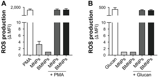 Results in Figure 3 show that, at a dose as high as 300 μg/mL, both MNPs and BMNPs were unable to activate ROS formation. Moreover, both MNPs and BMNPs were unable to enhance the PMA- or β-glucan-induced ROS production (Figure 3A,B).