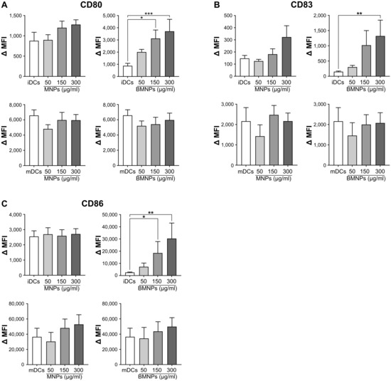 Effects of MNPs and BMNPs on monocyte-derived DC maturation. DCs cultured in the absence (iDCs) or presence (mDCs) of 100 ng/mL LPS were treated for 24 h with the indicated doses of MNPs or BMNPs. The expression of maturation markers CD80 (A), CD83 (B), and CD86 (C) was assessed by flow cytometry and shown as Δ MFI values. The results are expressed as the mean value + SEM of five independent experiments. * p < 0.05; ** p < 0.01; *** p < 0.001 by Friedman or Kruskal–Wallis test followed by Dunn’s multiple comparison test.