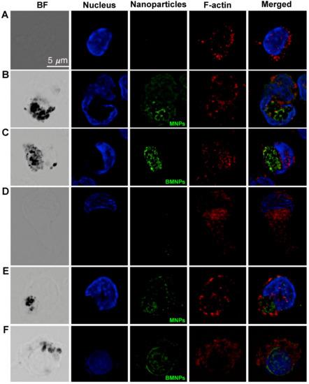 Internalization of MNPs and BMNPs by human monocytes and iDCs. Monocytes (panels (A–C)) and iDCs (panels (D–F)) were treated with 50 μg/mL GFP-conjugated MNPs (panels (B,E)) or BMNPs (panels (C,F)) for 2 h and the particle cellular uptake was visualized by wide-field deconvolution fluorescence microscopy. Untreated cells are illustrated in panels (A) and (D). Shown are six representative fields (top to bottom rows). From left to right, bright field (BF), DAPI (Nucleus), GFP (Nanoparticles), and SiR-actin (F-actin) individual channels are shown. On the far-right, merged channels are shown. Scale bar is 5 μm.