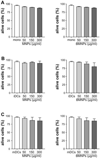 Effects of MNPs and BMNPs on the viability of human monocytes and DCs. Monocytes (mono) (A), immature DCs (iDCs) (B), and mature DCs (mDCs) (C) were challenged with 50, 150 or 300 μg/mL MNPs or BMNPs for 24 h and cell viability has been assessed by VYBRANT/SYTOX staining by flow cytometry. The results are expressed as the mean value of alive cells frequency + SEM of four independent experiments.