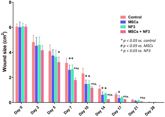 Wound size at different time points in each group. In the MSCs + NF3 group, the wound size presented a significant reduction from Day 5 onwards (p < 0.05). On Day 7, 10, and 14, all treatments promoted wound healing significantly (p < 0.05), while the combined treatment further enhanced the healing effect (p < 0.05). On Day 17, MSCs and the combined treatment kept reducing the wound size (p < 0.05), but no significant difference was observed in the NF3 group. The wound was closed and completely healed by Day 21 in the MSCs + NF3 group (p < 0.05). All wounds had completely healed by Day 28.