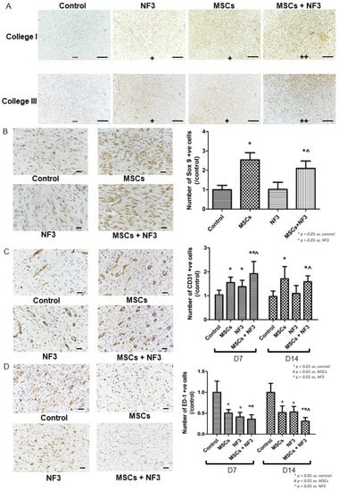 The representative images of IHC staining and their corresponding quantitative results. (A) Representative images of anti-collagen I and anti-collagen III staining (magnification: 100×, scale bar: 100 µm, − negative, + positive, ++ strong positive). The upper image is anti-collagen I and the lower is anti-collagen III. From left to right, the expression of the two collagens increased, and the most collagen formation was detected in the MSCs + NF3 group. (B) Anti-Sox 9 staining (magnification: 400×, scale bar: 100 µm). On the left is a representative photo of Sox 9-positive cells. Sox 9 is a marker of stem cells. We only stained the tissue collected on Day 14 to exclude the injected MSCs. The quantified data on the right indicated both MSCs and the combined treatment activated or recruited more Sox 9-positive cells (p < 0.05). No significant difference was observed in the NF3 group. (C) Anti-CD31 staining (magnification: 400×, scale bar: 100 µm). CD31 is a marker of neovascularization. On the left are representative images of CD31 positive cells. The graph on the right indicates that both MSCs and the combined treatment increased the number of CD31 positive cells on Day 7 and Day 14, with the highest number of positive cells detected in the combined group (p < 0.05). In the NF3 group, this increase was only observed on Day 7 (p < 0.05). (D) Anti-ED1 staining (magnification: 400×, scale bar: 100 µm). ED-1 is a pan-marker of macrophage, which stains both activated and resting types. On the left are representative images of ED-1 positive cells. The graph on the right shows that all treatments reduced the number of ED-1 positive cells significantly on both Day 7 and Day 14, while the combined treatment further enhanced this effect (p < 0.05).