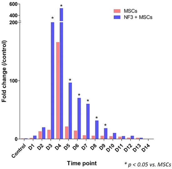 2.3. The Survival Rate and Survival Time of the Injected MSCs Was Increased by NF3 Administration