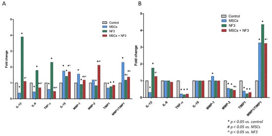 The expression of inflammation-related and ECM-related genes in skin. The tissues were collected 7 days and 14 days after surgery. (A) Gene expressions on Day 7. The expressions of anti-inflammatory genes (IL-1β, IL-6, and TNF-α) were downregulated in both the MSCs and MSCs + NF3 groups (p < 0.05). Their expressions were upregulated in the NF3 group. The expression of the anti-inflammatory gene (IL-10) was upregulated significantly in all groups (p < 0.05). In terms of ECM-related genes, the expressions of MMP-1 and MMP-2 were upregulated significantly in the MSCs and MSCs + NF3 groups (p < 0.05), while it was downregulated in the NF3 group. The expression of its inhibitor, TIMP1, was downregulated significantly in all groups (p < 0.05). After calculating the ratio of MMP1 to TIMP1, it was clear that this increased significantly in all groups (p < 0.05). (B) Gene expression on Day 14. The expression of IL-1β was downregulated significantly in the MSCs group (p < 0.05). Its expression was upregulated in the NF3 and MSCs + NF3 groups (p < 0.05). The expression of TNF-α was downregulated remarkably in all groups (p < 0.05). No difference was observed in the expression of IL-6 or IL-10. The expression of MMP-1 was upregulated only in the MSCs group (p < 0.05). The expression of MMP-2 and TIMP-1 was downregulated significantly in all groups (p < 0.05). After calculating the ratio of MMP1 to TIMP1, it was clear that this increased significantly (p < 0.05).