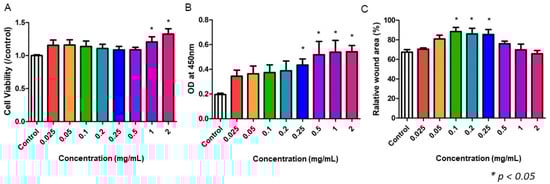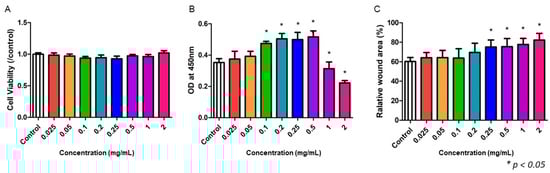 Different doses of NF3 (0.025–2 mg/mL) were added to the MSCs cultivation. The data suggested that high-dose NF3 increased the cell viability (1–2 mg/mL) and proliferation (0.25–2 mg/mL) of MSCs (p < 0.05). No significant differences were observed in other doses (Figure 5A,B). In the scratch test, only the medium dose of NF3 (0.1–0.25 mg/mL) promoted wound closure on the plate (p < 0.05). No significant differences were observed in other doses (Figure 5C).