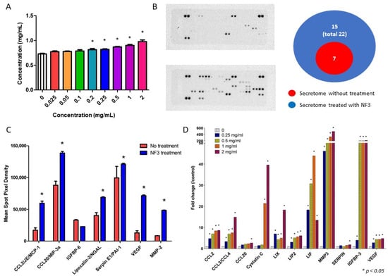After being treated with different doses of NF3, the total protein concentration in the serum-free supernatant was measured. The results showed that a higher concentration of protein was detected in the supernatant treated with high dose of NF3 (0.2–2 mg/mL) (p < 0.05) (Figure 6A). A total of 79 proteins were examined in the supernatants after NF3 administration. There were seven and twenty-two proteins detected in the untreated supernatant and NF3-treated supernatants, respectively. There were 15 unique proteins only found in the NF3-treated supernatant (Figure 6B). The function related to the wound healing of all proteins are listed in Table 1. After calculating the mean pixel density, the results suggested that the densities of the most common proteins were significantly higher in the NF3-treated supernatant (Figure 6C). RT-PCR was used for validation. Samples from different doses (0.25–2 mg/mL) were tested. The expressions of 11 corresponding genes were upregulated remarkably, and most of them presented in a dose-dependent manner (Figure 6D).