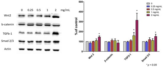 The results of western blot. (Left): an image of the western blot. As the dose of NF3 increased (0.25–2 mg/mL), the expressions of Wnt 2, TGFβ-1, and Smad 2/3 increased. (Right): the quantitative result. Compared with the control, the expressions of Wnt 2, TGFβ-1, and Smad 2/3 increased significantly after NF3 treatment (p < 0.05).