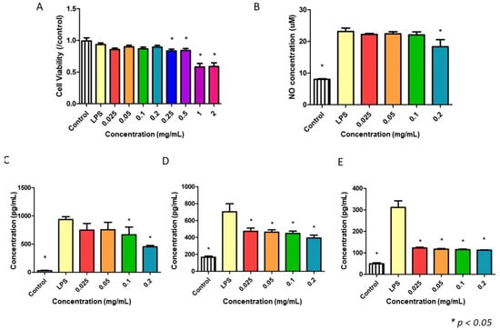 The effects of NF3 on RAW 264.7. Different doses of NF3 (0.25–2 mg/mL) were added to macrophage cultivation. RAW 264.7 was activated by 1 µg/mL LPS. (A) MTT. The data showed that a high dose of NF3 (0.25–2 mg/mL) reduced cell viability in RAW 264.7 (p < 0.05). (B) Nitric oxide (NO) inhibitory assay. The level of NO was suppressed when 0.2 mg/mL NF3 was supplied (p < 0.05). (C–E) ELISA results of IL-6, MCP-1, and TNF-α, respectively. NF3 (0.025–0.2 mg/mL) reduced the levels of pro-inflammatory cytokines in the supernatant of LPS-activated macrophages (p < 0.05).