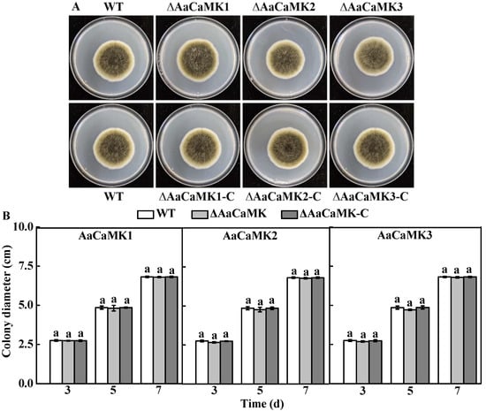 Subsequently, the AaCaMKs complementation strains (ΔAaCaMKs-C) were constructed following the method highlighted by Chen et al. [44]. Next, the complementation vectors were constructed by amplifying the cDNA of AaCaMKs and transformed into the ΔAaCaMKs mutants by PEG-mediated protoplast transformation. Successful complementation was then screened with G418 (0.25 g L−1). and the complementary strain ΔAaCaMKs-C was verified by PCR. The primers used are listed in Table S4.