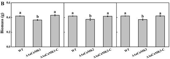 To assess the function of AaCaMKs in A. alternata, the gene deletion mutants, ΔAaCaMK1, ΔAaCaMK2, ΔAaCaMK3 and complementary strains ΔAaCaMK1-C, ΔAaCaMK2-C and ΔAaCaMK3-C were obtained by homologous recombination and PEG-mediated protoplast transformation. The wild-type (WT), ΔAaCaMKs and the complementary strain ΔAaCaMKs-C spore and hyphae morphology on PDA at 3, 5 and 7 days of incubation revealed that the colony morphology and growth of these strains were comparable (Figure 1A,B). However, ΔAaCaMK1 and ΔAaCaMK3 mutants produced a large number of conidia, 2-fold higher than WT, whereas the conidia produced by ΔAaCaMK2 mutant was 24% less than WT (Figure 2A). Compared to the WT strain, the single deletion AaCaMKs recorded a significantly reduced biomass accumulation after 5 d of incubation (Figure 2B). However, sporulation and biomass accumulation defects were rescued in ΔAaCaMKs-C strains. These results implied that the deletion of the AaCaMKs gene had no significant effect on the A. alternata growth; rather, it was involved in the sporulation and biomass accumulation.