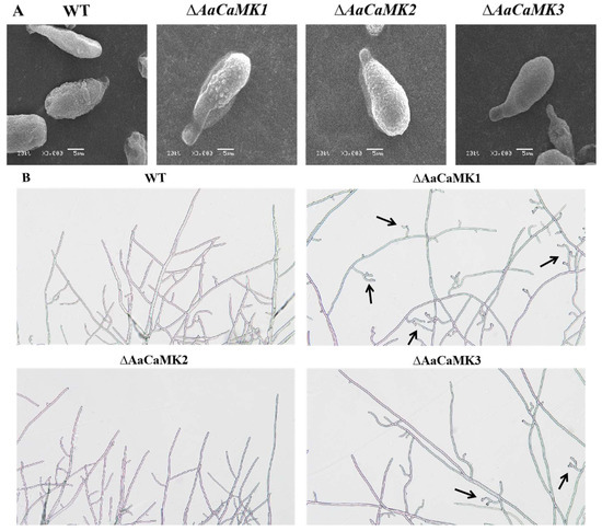 Observations under the scanning electron microscope revealed that the WT strain spores were elliptical and full of content and were nearly the same as those of the ΔAaCaMKs mutants (Figure 3A). In addition, the WT strain hyphae grew luxuriantly with many lateral branches but appeared short with abnormal branching in ΔAaCaMK1 and ΔAaCaMK3. However, in the ΔAaCaMK2 strain, the hyphae were not remarkably different from the WT strain (Figure 3B). These results imply that AaCaMKs played a key role in A. alternata hyphae growth.