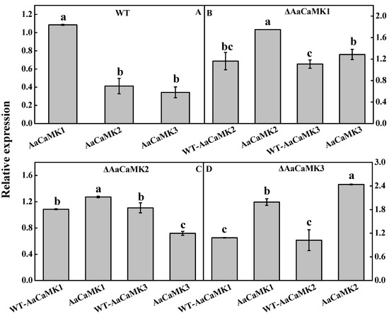 The transcription levels of AaCaMKs genes. The expression level of the AaCaMKs gene in WT strains was plotted as a control. (A) Expression levels of AaCaMK1, AaCaMK2 and AaCaMK3 in WT. (B) Expression levels of AaCaMK2 and AaCaMK3 in ΔAaCaMK1. (C) Expression levels of AaCaMK1 and AaCaMK3 in ΔAaCaMK2. (D) Expression levels of AaCaMK1 and AaCaMK2 in ΔAaCaMK3. Bars indicate standard error (±SE). Different letters indicate significant differences (p < 0.05).