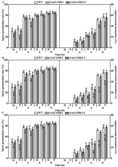 The spore germination and appressorium formation of AaCaMK1 (A), AaCaMK2 (B) and AaCaMK3 (C) induced by hydrophobic (H) and pear wax (P). Bars indicate standard error (±SE). Different letters indicate significant differences (p < 0.05).