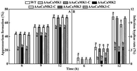 The appressorium and infective hyphae formation of WT, ΔAaCaMKs and ΔAaCaMKs-C were observed on the pear fruit peel. Compared to the WT, the appressorium formation on ΔAaCaMK1, ΔAaCaMK2 and ΔAaCaMK3 were reduced by 52, 45 and 51% at 6 h of induction, respectively (Figure 7A). After 12 h post-inoculation, the infection hyphae formation levels in ΔAaCaMK1, ΔAaCaMK2 and ΔAaCaMK3 were significantly reduced by 65, 74 and 65% compared to the WT, respectively (Figure 7B).