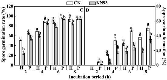 A. alternata spore germination and appressorium formation following treatment with KN93. (A) A. alternata spore germination at different KN93 concentrations; (B) A. alternata appressorium formation at different KN93 concentrations; (C) A. alternata spore germination following treatment with KN93 under hydrophobic (H) and pear wax (P) substrates; (D) A. alternata appressorium formation following treatment with KN93 using hydrophobic (H) and pear wax (P) substrates. The ddH2O was used as a control. The vertical line indicates a standard error (±SE). Different letters indicate significant differences (p < 0.05).
