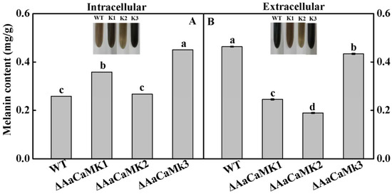A. alternata melanin content. (A) The intracellular melanin content in WT, ΔAaCaMK1, ΔAaCaMK2 and ΔAaCaMK3. (B) The extracellular melanin content in WT, ΔAaCaMK1, ΔAaCaMK2 and ΔAaCaMK3. Bars represent standard deviations of means of three replicates. Different letters in the graph indicate statistical differences (p < 0.05).
