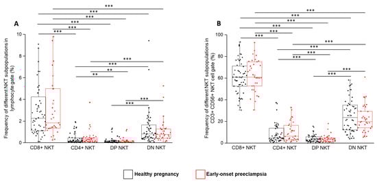 Using the flow cytometric gating strategy (Figure 1.), different NKT cell subpopulations (CD8⁺/CD4⁻ (CD8⁺), CD8⁻/CD4⁺ (CD4⁺), CD8⁺/CD4⁺ (DP), CD8⁻/CD4⁻ (DN)) were identified based on the presence of CD8 and CD4 surface markers. Notably, significant differences were revealed in the frequency of the examined subsets obtained from the peripheral blood of EOP patients and healthy pregnant women (Figure 2.). The major subpopulation is the CD8⁺/CD4⁻ subset, followed by the DN, the CD8⁻/CD4⁺ and the DP subsets. The frequencies of the NKT cell subpopulations both in the lymphogate (Figure 2A) and the CD3⁺CD56⁺ NKT gate (Figure 2B) significantly differ from each other within one tested cohort. However, there was no significant difference between the EOP patients and healthy pregnant women.