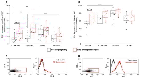 PD-1 and PD-L1 expression by different NKT cell subpopulations in EOP and healthy pregnancy. PD-1 receptor expression (A) and PD-L1 ligand expression (B) by the CD8 and CD4 positive and negative NKT cell subpopulations in EOP patients and healthy pregnant women. The solid bars represent medians of 18 and 17 determinations, respectively. The boxes indicate the interquartile ranges, and the whiskers show the most extreme observations. The middle square within the box represents the mean value. Significant differences with p-values < 0.01 *** and <0.03 ** are indicated. Representative FACS plots show the PD-1 surface marker (C) and PD-L1 surface molecule (D) expression by cells in the lymphocyte gate. Fluorescent minus one (FMO) control was used to determine PD-1 and PD-L1 expression.