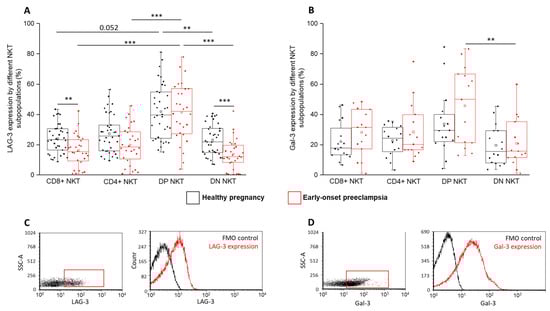 LAG-3 and Gal-3 expression by different NKT cell subpopulations in EOP and healthy pregnancy. LAG-3 receptor (A) and Gal-3 ligand expression (B) by the CD8 and CD4 surface molecule positive and negative NKT cell subpopulations in EOP patients and healthy pregnant women. The solid bars represent medians of 37, 28, 16 and 15 determinations, respectively. The boxes indicate the interquartile ranges, and the whiskers show the most extreme observations. The middle square within the box represents the mean value. Significant differences with p-values < 0.01 *** and <0.03 ** are indicated. Representative FACS plots show the expression of LAG-3 (C) and Gal-3 molecule (D) by cells in the lymphocyte gate. FMO control was used to determine LAG-3 and Gal-3 positivity.