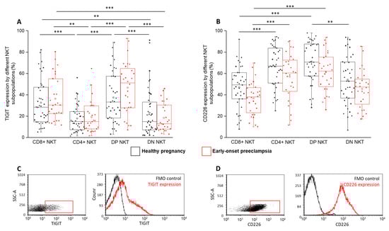 TIGIT and CD226 receptor expression by different NKT cell subpopulations in EOP and healthy pregnancy. TIGIT (A) and CD226 receptor expression (B) by the CD8 and CD4 surface molecule positive and negative NKT cell subpopulations in EOP patients and healthy pregnant women. The solid bars represent medians of 39, 40, 39 and 28 determinations, respectively. The boxes indicate the interquartile ranges, and the whiskers show the most extreme observations. The middle square within the box represents the mean value. Significant differences with p-values < 0.01 *** and <0.03 ** are indicated. Representative FACS plots show the TIGIT (C) and CD226 surface molecule (D) expression by cells in the lymphocyte gate. FMO control was used to determine TIGIT and CD226 expression.