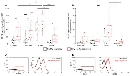 CD112 and CD155 ligand expression by different NKT cell subpopulations in EOP and healthy pregnancy. CD112 (A) and CD155 ligand expression (B) by the CD8 and CD4 surface molecule positive and negative NKT cell subpopulations in EOP patients and healthy pregnant women. The solid bars represent medians of 16, 16, 17 and 17 determinations, respectively. The boxes indicate the interquartile ranges, and the whiskers show the most extreme observations. The middle square within the box represents the mean value. Significant differences with p-values < 0.01 ***, <0.03 ** and <0.05 * are indicated. Representative FACS plots show the CD112 surface marker (C) and CD155 surface molecule (D) expression by cells in the lymphocyte gate. FMO control was used to determine CD112 and CD155 expression.