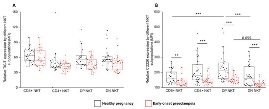 After the surface analyses, we examined the mean fluorescent intensity (MFI) of inhibitory TIGIT and activatory CD226 receptors. Although a significant difference has not been detected regarding the MFI of TIGIT expression, the relative expression of CD226 was significantly lower in EOP patients compared to healthy controls in all four NKT subpopulations. Furthermore, in healthy patients, a significantly elevated CD226 MFI was determined in the DP subset compared to the CD8⁺ and DN subsets (Figure 7B).