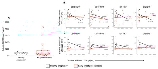 2.7. The Serum Level of CD226 and the Relationship between the Surface and the Relative Expression of CD226 by NKT Cell Subsets in EOP Patients and Healthy Pregnant Women