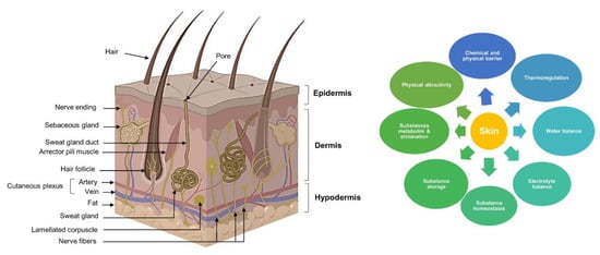 Skin plays a wide range of functions. It offers chemical and physical protection for the body against external injuries such as pathogens, UV radiation, chemical threats, dehydration, and temperature fluctuations [8]. It also ensures water and electrolyte balance (sweat glands and epidermal barrier) and thermoregulation (thermoreceptors) and participates in the immune response (skin-associated lymphoid tissues (SALT)). The presence of nerve endings, such as Meissner, Pacinian, and Ruffini corpuscles, along with Krause’s bulbs and Merkel cells, confers a sensory function to the skin. Another important function is linked to the homeostasis, metabolism, storage, selective absorption, and elimination of substances [12]. Besides these biological functions, skin plays a role in physical appeal (Figure 1) [9].