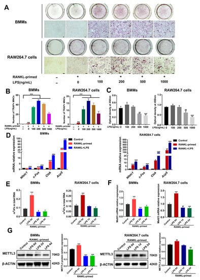 To determine whether METTL3 participates in osteoclast development modulation under inflammatory environments, we first constructed an in vitro model of LPS-induced osteoclastogenesis. As determined using TRAP staining, after bone marrow-derived macrophages (BMMs) and RAW264.7 cells were pretreated with RANKL (50 ng/mL), the stimulation of LPS (100–1000 ng/mL) increased the number of TRAP-positive multinucleated cells (Figure 1A,B). LPS at a 200 ng/mL concentration had no effect on the cell viability of osteoclast precursors, as suggested using a CCK8 assay (Figure 1C). Accordingly, we chose 200 ng/mL LPS to induce inflammatory osteoclastogenesis in subsequent experiments. The data from qRT-PCR showed that the mRNA expression of osteoclastic transcription factors Nfatc1 and c-Fos, as well as osteoclastic markers Acp5 and Ctsk, was promoted through LPS stimulation in RANKL-pretreated cells (Figure 1D). Thus, we confirmed that LPS promoted osteoclast formation in RANKL-pretreated osteoclast precursors and successfully established an in vitro inflammatory osteoclastogenesis model.