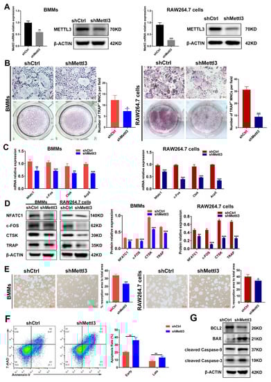 It has been demonstrated that the role of METTL3 is inconsistent in different cells and tissues []. The experimental data from our previous study also evidenced the differential role of METTL3 in human dental pulp cells (HDPCs) and mouse macrophages [,]. In LPS-treated HDPCs, the expression of METTL3 was elevated, and METTL3 knockdown reduced the LPS-induced expression of inflammatory cytokines by increasing the expression of MyD88S, a splicing variant of MyD88 that inhibits inflammatory cytokine production []. Conversely, METTL3 expression levels decreased in macrophages stimulated with LPS, and METTL3 knockdown promoted inflammatory cytokine expression by enhancing mRNA stability and the expression of NOD1 and RIPK2, which, consequently, upregulated NOD1 signaling []. To further explore the potential role of METTL3 in inflammatory osteoclastogenesis, short hairpin RNA (shRNA) was used to inhibit METTL3 expression in BMMs and RAW264.7 cells. The expression of METTL3 mRNA and protein markedly decreased in the shMettl3 group (Figure 2A), confirming the efficiency of METTL3 knockdown. After a METTL3 deficiency was reached, BMMs and RAW264.7 cells were pretreated with RANKL and stimulated with LPS to be differentiated into osteoclasts. As shown by TRAP staining, the knockdown of METTL3 reduced the number of mature osteoclasts (Figure 2B). The mRNA and protein levels of osteoclast-related genes, including Nfatc1, c-Fos, Acp5 and Ctsk, also decreased in the shMettl3 group compared with the shRNA control group (Figure 2C,D). A pit formation assay was performed to assess the effect of METTL3 on LPS-induced osteoclast function. The results displayed a significant reduction in the bone resorption area after METTL3 knockdown (Figure 2E). In addition, the flow cytometry and quantification analysis showed that the early and late cell apoptosis rate increased in the shMettl3 group (Figure 2F). Similarly, Figure 2G shows that the anti-apoptotic protein BCL2 level decreased, while levels of pro-apoptotic protein BAX and apoptotic markers cleaved caspase-9 and cleaved caspase-3 increased in Mettl3-deficient cells, further confirming the aggravated cell apoptosis caused by METTL3 knockdown. These data indicated that METTL3 knockdown impeded osteoclast differentiation as well as the bone-resorbing activity, and promoted osteoclast apoptosis under inflammatory conditions.