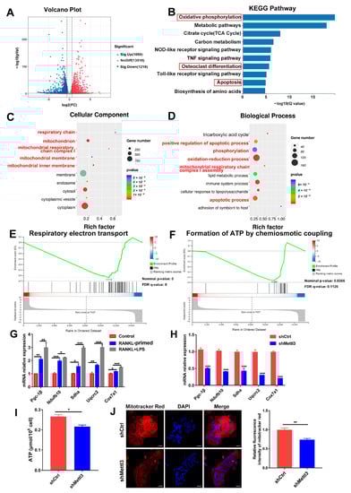 Effect of METTL3 deficiency on mitochondrial homeostasis during LPS-induced osteoclastogenesis. (A) The volcano plot exhibited differentially expressed genes (DEGs) between the shMettl3 and shCtrl groups (p < 0.01, fold change >1.5 or <0.67, compared to the shCtrl group). (B) Enriched KEGG pathways of DEGs. (C,D) GO analysis bubble charts of cellular components and biological processes showing the top ten enriched terms of DEGs. (E,F) The GSEA enrichment plots of mitochondrial function-related gene sets, including respiratory electron transport (E) and formation of ATP through chemiosmotic coupling (F). The nominal p-value and false discovery rate (FDR) are shown in plots. Significance threshold was set to p-value < 0.05, FDR < 0.25. (G) qRT-PCR was performed to detect the mRNA expression of Pgc-1β, Ndufb10, Sdha, Uqcrc2 and Cox7a1 during LPS-induced osteoclastogenesis. (H–J) Osteoclast precursors transfected with the Mettl3 shRNA or negative control shRNA were induced to differentiate into osteoclasts. (H) Pgc-1β, Ndufb10, Sdha, Uqcrc2 and Cox7a1 mRNA levels were measured using qRT-PCR. β-Actin was used as an internal normalized control. (I) ATP content was detected using an ATP assay kit. (J) Confocal images of osteoclasts stained with Mito-Tracker Red CMXRos and DAPI. Scale bars, 25 μm. The relative fluorescence intensity of Mito-Tracker Red was analyzed with the ImageJ software. The results are shown as the mean ± SD (n = 3). * p < 0.05; ** p < 0.01; *** p < 0.001.