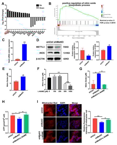 To further clarify the potential downstream target of METTL3 during inflammatory osteoclastogenesis, we sorted the DEGs screened using RNA sequencing according to their fold change. The top 20 DEGs were depicted in Figure 4A, with Nos2 being the most significantly upregulated. Nos2 encodes the inducible nitric oxide synthase (iNOS) to catalyze nitric oxide (NO) production, which has been reported to act as a negative regulator of mitochondrial function integrity and participate in cell fate modulation []. GSEA analysis of RNA-Seq showed a significant promotion of the nitric oxide biosynthetic process in the shMettl3 group (Figure 4B). As verified using qRT-PCR and Western blotting, Nos2 mRNA and iNOS protein levels in the shMettl3 group were elevated (Figure 4C,D). Moreover, a notable increase in NO content was observed following the upregulation of iNOS expression caused by METTL3 knockdown (Figure 4E).