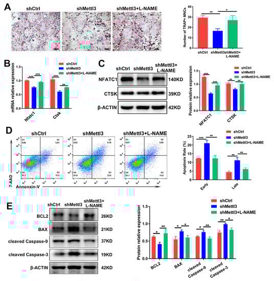 The rescuing effect of L-NAME on osteoclast differentiation and apoptosis in METTL3-silenced cells treated with LPS. Osteoclast precursors transfected with shRNA and pretreated with RANKL were differentiated into osteoclasts by LPS (200 ng/mL) induction in the absence or presence of L-NAME (500 μM). (A) Images of TRAP staining. Scale bars, 200 μm. The mRNA and protein levels of NFATC1 and CTSK were assessed using qRT-PCR (B) and Western blotting (C). (D) The apoptosis rate of osteoclasts was determined by flow cytometry analysis. (E) The protein levels of BCL2, BAX, cleaved caspase-9 and cleaved caspase-3 were evaluated using Western blotting. β-Actin was used as an internal control for qRT-PCR and Western blotting. The data are shown as the mean ± SD (n = 3). * p < 0.05; ** p < 0.01; *** p < 0.001.