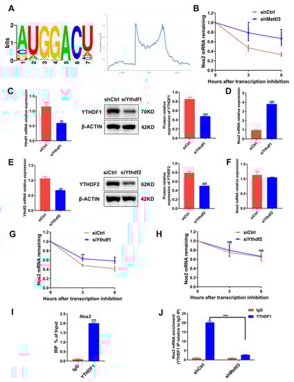 The role of METTL3, YTHDF1 and YTHDF2 in the degradation of Nos2 mRNA. (A) RMBase 2.0 database analysis of m6A motifs and m6A peak distribution on Nos2 transcript. (B) RAW264.7 cells transfected with shRNA were differentiated into osteoclasts. Then, cells were stimulated with actinomycin D (5 μg/mL) to inhibit transcription. The Nos2 mRNA levels at the indicated time after actinomycin D treatment were assessed using qRT-PCR. (C–H) RAW264.7 cells transfected with siRNA were induced to differentiate into osteoclasts. (C,E) YTHDF1 and YTHDF2 protein levels were determined with Western blotting after siRNA-mediated gene knockdown. (D,F) Nos2 mRNA expression in the siYthdf1 group or the siYthdf2 group was measured with qRT-PCR. (G,H) Osteoclast precursors were treated with actinomycin D (5 μg/mL) for the indicated time following inflammatory osteoclastogenesis. The mRNA expression of Nos2 was determined using qRT-PCR. Cells transfected with the negative control siRNA acted as the control group. (I,J) A RIP-qPCR assay using an IgG antibody and an anti-YTHDF1 antibody was performed to determine the binding of Nos2 mRNA with YTHDF1. β-Actin was used as an internal control for qRT-PCR and Western blotting. The data are shown as the mean ± SD (n = 3). ns, no significance; * p < 0.05; ** p < 0.01; *** p < 0.001.