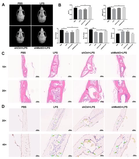 The effect of METTL3 interference on LPS-induced osteolysis in mouse calvaria. (A) Representative micro-CT reconstruction images of the murine calvaria from each group. (B) Quantitative analysis of the bone volume against tissue volume (BV/TV), bone mineral density (BMD), trabecular number (Tb. N), trabecular thickness (Tb. Th) and trabecular separation (Tb. Sp). (C,D) The calvarial bone slices were stained with H&E and TRAP. (C) Histological slide images of H&E staining at 10× and 20× magnification. (D) Images of TRAP staining at 20× and 40× magnification. Upper scale bars, 100 μm; lower scale bars, 50 μm. The green arrows indicate osteoclasts. The data represent the mean ± SD (n = 3). * p < 0.05; *** p < 0.001.