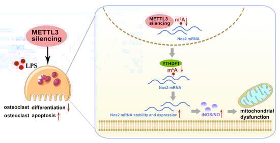 In conclusion, our study demonstrated that lentivirus-mediated METTL3 silencing suppressed the inflammatory osteoclast differentiation and bone-resorbing capacity in vitro, as well as protecting against LPS-induced osteolysis in vivo. Mechanistically, METTL3 silencing enhanced the stability and expression of Nos2 mRNA in a YTHDF1-dependent manner and aggravated iNOS/NO-mediated mitochondrial dysfunction, which, consequently, impaired osteoclastogenesis and promoted osteoclast apoptosis in the inflammatory environments (Figure 8). These findings uncovered the potential role of METTL3 in modulating LPS-induced osteoclastogenesis. Given the importance of osteoclast activity in the pathogenesis of inflammatory bone disorders, this study may provide a novel epigenetic perspective for future research on inflammatory osteolytic diseases. However, since the regulatory role of METTL3-mediated m6A is complicated and exhibits cell-type specificity, the precise function and underlying regulatory mechanisms of m6A in different cells and tissues during the development of inflammatory diseases need additional in-depth studies.