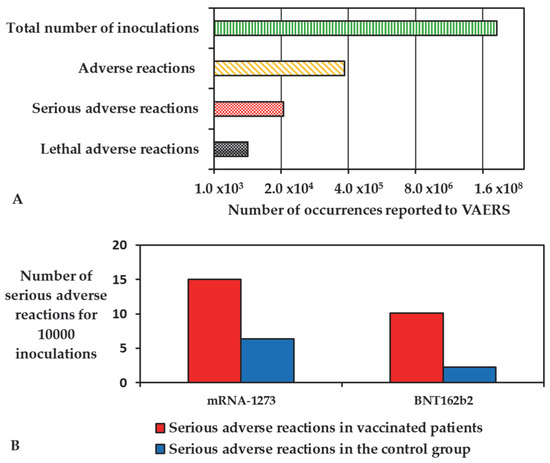 (A) Adverse reactions reported to the VAERS database in comparison with the total inoculations in US after 6 months of vaccination campaign; (B) comparison between the serious adverse reactions reported during the clinical trials of the mRNA vaccines and their placebo control groups.