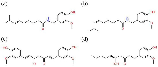 Molecular structural of (a) capsaicin, (b) zucapsaicin, (c) curcumin, (d) 6-gingerol.