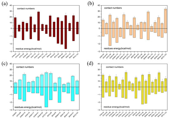 where is with being the Boltzmann constant and in Equation (7), the thermal average of can be carried out by time-averaging along the MD trajectory in Equation (8). Then, the restricted condition of IE was < 3.6 kcal; otherwise, the results of IE could impossibly converge [68]. Furthermore, in order to obtain the residue energy decomposition of the two chains of dimers, gmxMMPBSA was employed to generate the per-residue energy to enable analyzing the impact of the key residues.