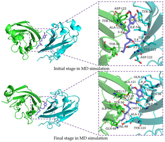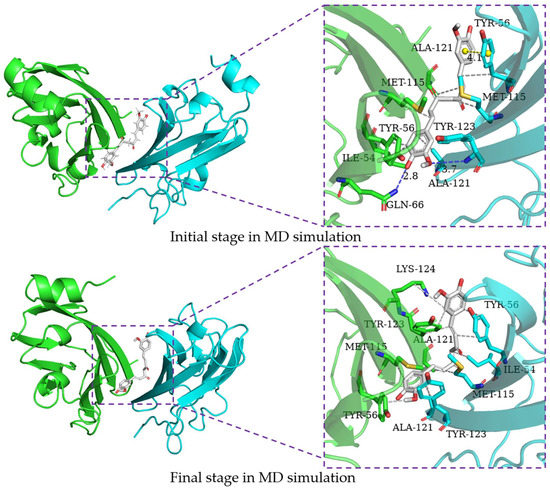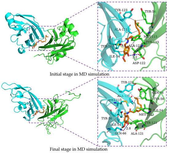 In order to characterize the structure variation of small molecules and key residues from 0 to 200 ns, the binding modes of small molecules in the binding pocket are analyzed by the PLIP program and VMD, in which only H-bonds donors and acceptors with an occupancy of more than 10% occupancy are shown in Table 7. It can be seen that the capsaicin and zucapsaicin have generated H-bonds with (B)Gln-66 and (A)Gln-66, respectively, in which the H-bonds occupancy between the carbonyl group of Gln-66 sidechain and hydroxyl group of capsaicin and zucapsaicin reached 91.40% and 65.87% (Table 7). Meanwhile, (A)Ile-54, (A)Tyr-56, (A)Gln-66, (A)Met-115, (A)Ala-121, (A)Tyr-123, (B)Ile-54, (B)Tyr-56, (B)Met-115, (B)Ala-121 and (B)Tyr-123 are the residues that can form a hydrophobic interaction with capsaicin, as shown in Figure 6. Zucapsaicin interacts with (A)Tyr-56, (A)Gln-66, (A)Met-115, (A)Ala-121, (A)Tyr-123, (B)Ile-54, (B)Tyr-56, (B)Met-115 and (B)Ala-121 by hydrophobic interaction (Figure 7). 6-Gingerol interacts with (A)Ile-54, (A)Tyr-56, (A)Val-68, (A)Met-115, (A)Ala-121, (A)Tyr-123, (B)Ile-54, (B)Tyr-56, (B)Val-68, (B)Met-115, (B)Ala-121 and (B)Tyr-123 by hydrophobic interaction; additionally, (A)Gln-66 and (A)Ser-117 produced H-bonds with 6-gingerol (Figure 8). For the curcumin system, (A)Met-115, (A)Ala-121, (A)Tyr-123, (B)Ile-54, (B)Tyr-56, (B)Gln-66, (B)Met-115 and (B)Ala-121 play an important role in stabilizing dimer by hydrophobic interaction (Figure 9).