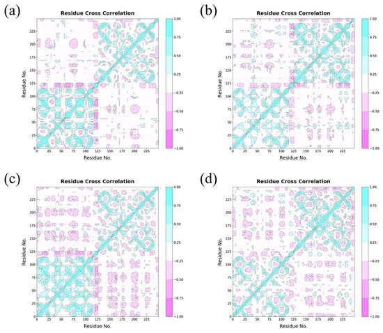Cross-correlation matrixes of fluctuations in the x-, y- and z-coordinates for atoms belonging to the PD-L1 dimer in the (a) capsaicin, (b) zucapsaicin, (c) curcumin and (d) 6-gingerol systems.