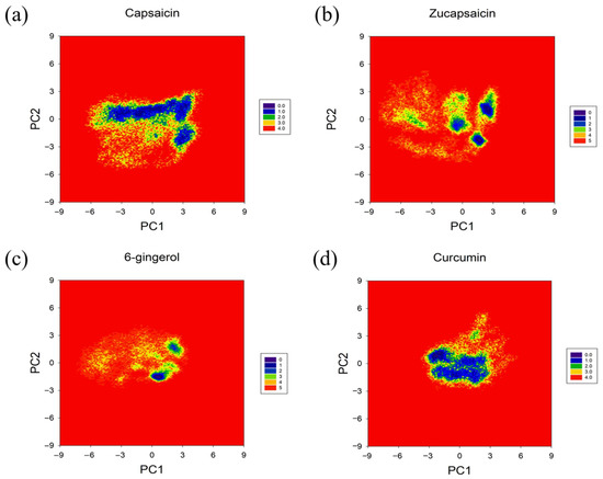 Free energy landscapes (KT) of the (a) capsaicin, (b) zucapsaicin, (c) curcumin and (d) 6-gingerol systems. PC1 and PC2 represent principal components 1 and 2, respectively.