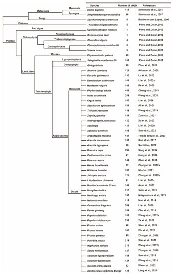 Phylogenetic analysis of the species based on genome-wide association study of the basic helix-loop-helix (bHLH) family. The total number of bHLH transcription factors identified from the genome of each species are indicated [,,,,,,,,,,,,,,,,,,,,,,,,,,,,,,,,,,,,,,,,,,,].