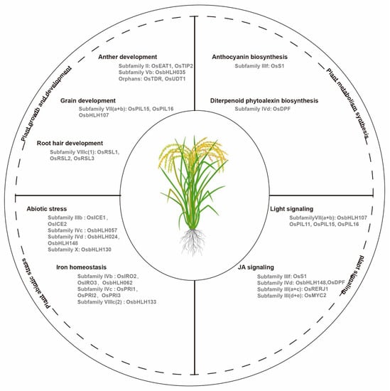 Due to the progressive evolution of sequencing technologies, many genome databases are available for many important plants. Recently, many researchers have performed genome-wide studies on bHLH transcription factors in various crops, and they have widely studied the functions of bHLH transcription factors in the model plant Arabidopsis thaliana; however, we lack extensive studies on the functions of the bHLH transcription factors in other plants. In this review, we first classify the information on the functionally characterized bHLH transcription factors according to four categories: (i) plant growth and development; (ii) metabolism synthesis; (iii) plant signaling, and (iv) abiotic stress response, and we explore their roles in various crops, and especially in rice. We also discuss the research gap and perspectives for future research for the genetic applications of bHLH transcription factors in crop breeding.