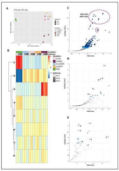 2.4. Cluster Analysis Identified Groups of Genes Characteristic for hIPS Cells, for Differentiated Conditions and in Addition for NICD Condition