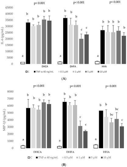 Effect of coffee microbial metabolites DHCA, DHFA, and HHA at 0 (C), 0.5, 1, 5 and 10 μM with cotreatment of TNF-α at 40 ng/mL during 6 h on the production of interleukin-6 (IL-6; (A)), macrophage inflammatory protein 1 (MIP-1β; (B)), monocyte chemoattractant protein 1 (MCP-1; (C)) and interleukin-8 (IL-8; (D)) in HepG2 cells. Results, expressed as pg/mL, are means ± SD (n = 4). The p values above the figures represent ANOVA results and different letters denote statistical differences according to the Bonferroni test within the same compound (p < 0.05).